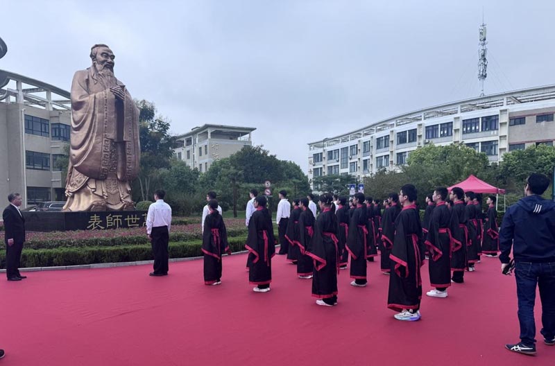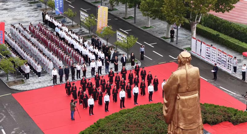 上午9時28分,典禮正式啟幕。在全體師生莊重的注目中,四位主禮嘉賓緩緩揭去覆蓋于圣像之上的紅色帷幕。一尊高7.2米、面容慈和、風范儒雅的孔子圣像巍然矗立于校園,其深邃的目光仿佛跨越千年時空,將智慧的光芒灑滿天一校園。在場師生自發(fā)整理衣冠,肅立致敬,向先師行注目禮,現(xiàn)場洋溢著對傳統(tǒng)文化與教育先哲的崇高敬意。