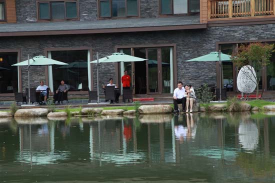 炎炎夏日,有什么比靜心清涼要來的重要!離黃山區(qū)譚家橋鎮(zhèn)約五公里遠(yuǎn)有一處山坳,這里山巒疊嶂,松柏掩映,一座全木質(zhì)結(jié)構(gòu)的仿古建筑就矗立于此。會(huì)館二層的陽臺(tái)就面對(duì)著黃山的輪廓,云霧繚繞的黃山奇觀讓你無需遠(yuǎn)足即可一覽無余。會(huì)館前面一處水潭,碧波蕩漾,水草豐盛,魚兒成群。水潭旁有可以休憩的亭榭和陽傘雅座。這個(gè)平靜的地方適合享受清茶和感悟自然。