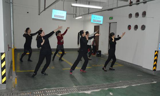 鼎盛國(guó)際員工在地下車庫認(rèn)真排練店慶節(jié)目