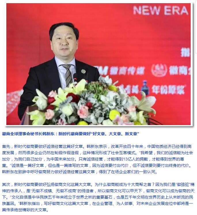 1月25日,以“新時(shí)代新?lián)?dāng) 新創(chuàng)造新未來(lái)”為主題的2017徽商全球理事會(huì)年會(huì)迎來(lái)第二天的精彩議程,在前一天的“徽商發(fā)展高峰論壇”“徽商投資考察安慶行”等環(huán)節(jié)之后,今天上午的議程更加凸顯了“徽商全球理事會(huì)”平臺(tái)作為“徽商優(yōu)質(zhì)資源整合者”的服務(wù)理念、資源優(yōu)勢(shì)和責(zé)任擔(dān)當(dāng)。