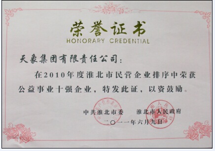 2010年度淮北市民營企業(yè)益事業(yè)十強(qiáng)企業(yè)榮譽(yù)證書